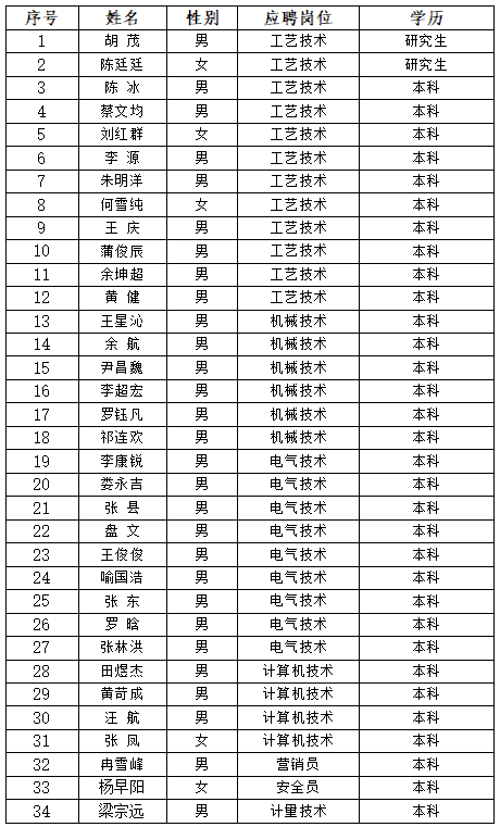 根據《貴州鋼繩股份有限公司招聘錄用職工管理規定》有關要求,公司招聘工作領導小組在2023年4月至7月對應聘人員經篩選、資格審核、組織考核(或面試)、體檢等程序,確定擬錄用人員34人,現予以公示。公示期間,如對人選有異議,請向貴州鋼繩股份有限公司人力資源部(公司辦公室)反映。