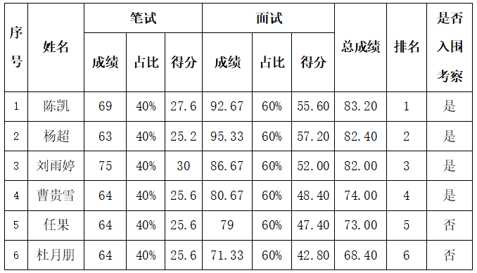 根據(jù)2023年7月25日發(fā)布的《貴州鋼繩(集團)有限責任公司公開招聘公告》中關于招聘紀檢監(jiān)察主管的招聘程序,經(jīng)過綜合測試(筆試和面試),根據(jù)綜合成績,按照1:2考察入圍比例,有4人進入考察環(huán)節(jié)。綜合測試成績及進入考察環(huán)節(jié)人員名單如下: