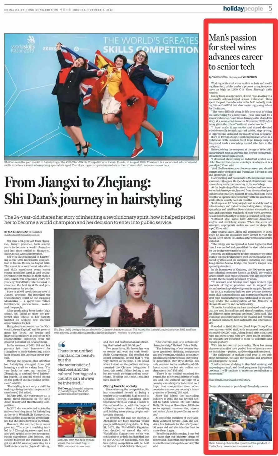 10月3日,公司職工周家榮事跡(周家榮:匠心有傳承 鋼絲擰成繩)在中國日報旗艦版、香港版“國慶人物”欄目配圖刊發(fā)Man’s passion for steel wires advances career to senior tech。