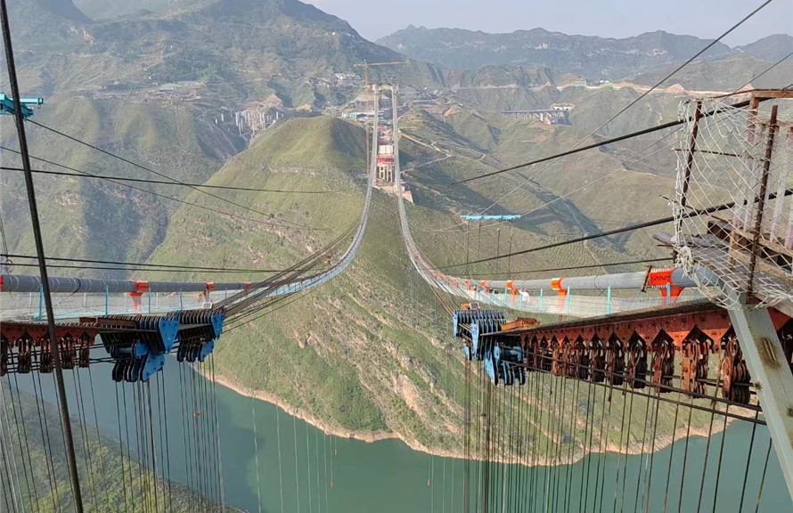牂牁江大橋位于六盤水市烏蒙山國家地質公園內,全長1849米,為雙塔單跨鋼桁梁懸索橋,是納晴高速建設項目的重點控制性工程。遠遠望去,大橋的兩根主纜像兩條巨龍飛架在橋墩之上,每根主纜由199根索股、18109根鍍鋅鋁稀土合金鋼絲組成,兩根主纜的鋼絲加起來,總長度超過6.9萬公里,可繞地球1.7圈,被稱作大橋的“生命線”。大橋吊索采用1960兆帕級高強度鍍鋅鋁稀土合金密封鋼絲繩制作,達到了國際領先水平,是國內橋梁建設領域首次應用。