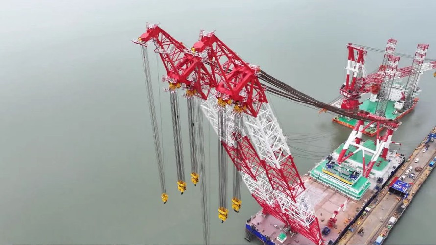 二航卓越”起重船是國內迄今同類型船舶中技術最先進、起重能力最大的雙臂架變幅式起重船,該船總長165米,型寬52米,型深11米,設計吃水6.5米,采用3臺3350千瓦主發電機組,2臺2000千瓦主推進器,配備8點錨泊定位系統,額定起重能力5500噸,其起重量、起升高度可覆蓋130米跨度非通航孔橋梁吊裝,具備47米限高通航能力。