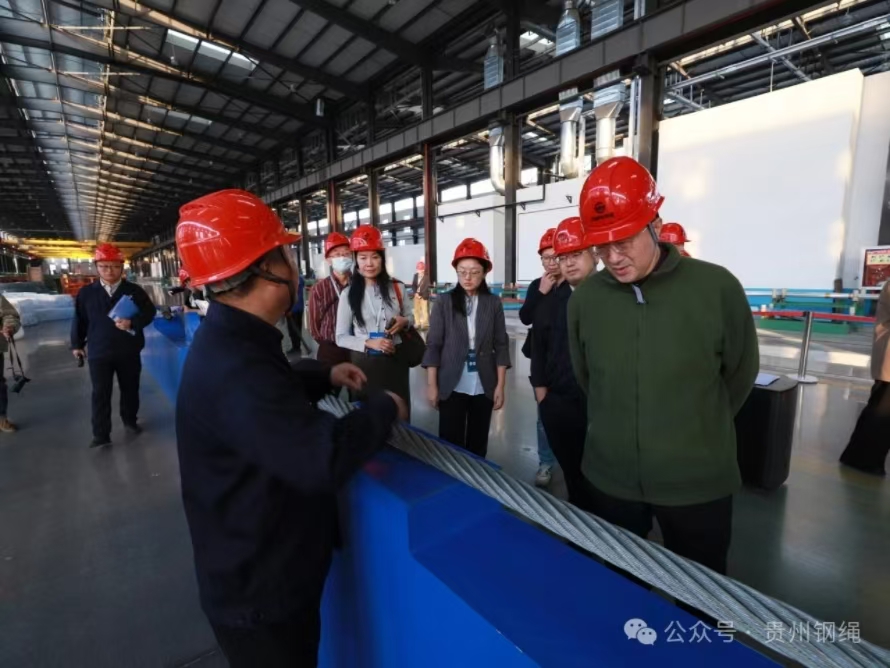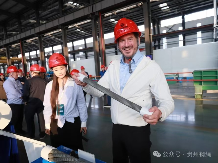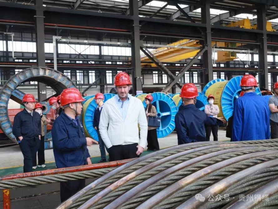 當天下午,來自15個國家的駐華使節、中外專家學者、外籍博主、青年學生、企業代表等走進貴州鋼繩,參觀生產現場,觀看展品,了解貴州鋼繩產品在牂牁江大橋、花江峽谷大橋上的應用情況,感受中國機遇下貴州制造業的魅力和超強實力,共繪“機遇中國 多彩世界”美好藍圖。貴州鋼繩股份有限公司副總經理賀孝宇陪同外國友人參訪團參觀生產現場。