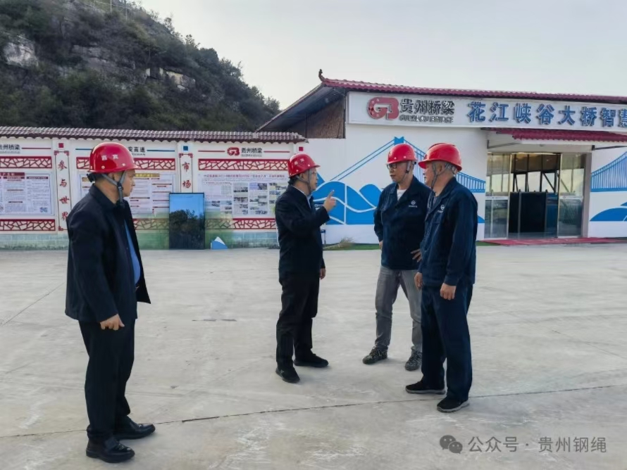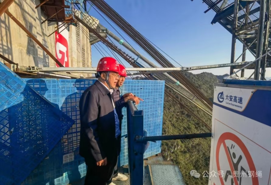 在六安高速花江峽谷大橋施工現(xiàn)場,汪家強(qiáng)與項(xiàng)目部經(jīng)理吳朝明進(jìn)行了深入交流,了解大橋建設(shè)施工進(jìn)度及產(chǎn)品需求計(jì)劃,認(rèn)真聽取用戶意見、建議,并就吊索產(chǎn)品交貨期作了對接。六安公司陳飛董事長詳細(xì)介紹了世界第一高橋花江峽谷大橋的橋墩建造、索鞍鑄鍛、放索等多項(xiàng)創(chuàng)新技術(shù),特別是貴州鋼繩聯(lián)合北交大共同研發(fā)的超2300米應(yīng)力應(yīng)變智慧索,在世界橋梁范圍屬首創(chuàng)。
