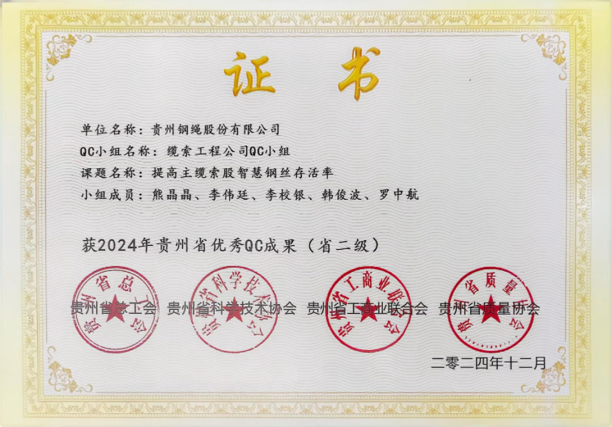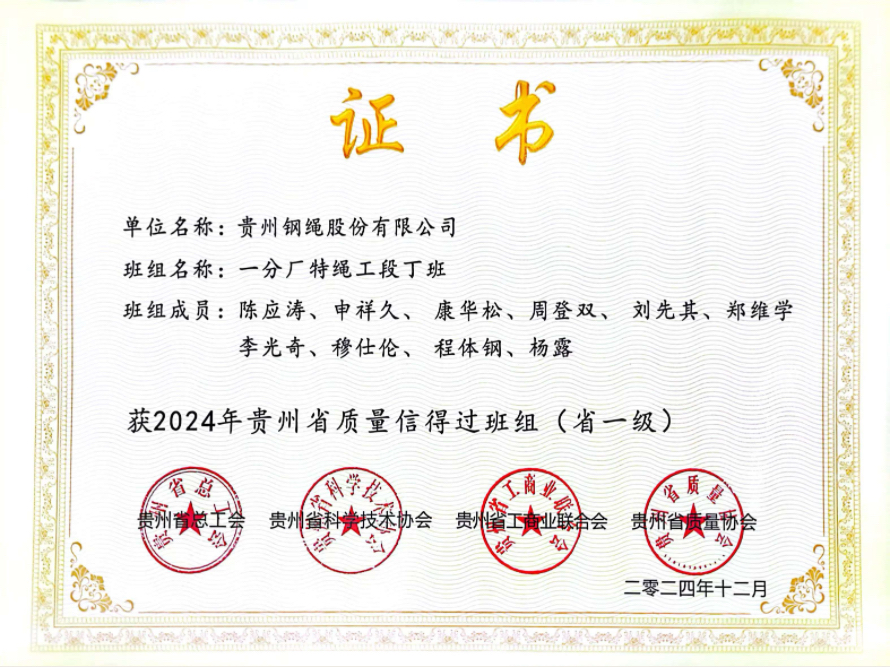 本次質量信得過班組是按照T/CAQ 10204-2017《質量信得過班組建設準則》標準進行成果申報。一分廠特繩工段丁班、二分廠鋼繩車間成繩工段乙班和四分廠酸洗班獲得2024年貴州省“質量信得過班組”建設成果大賽(一級);三分廠熱處理工序乙班獲得2024年貴州省“質量信得過班組”建設成果大賽(三級)。