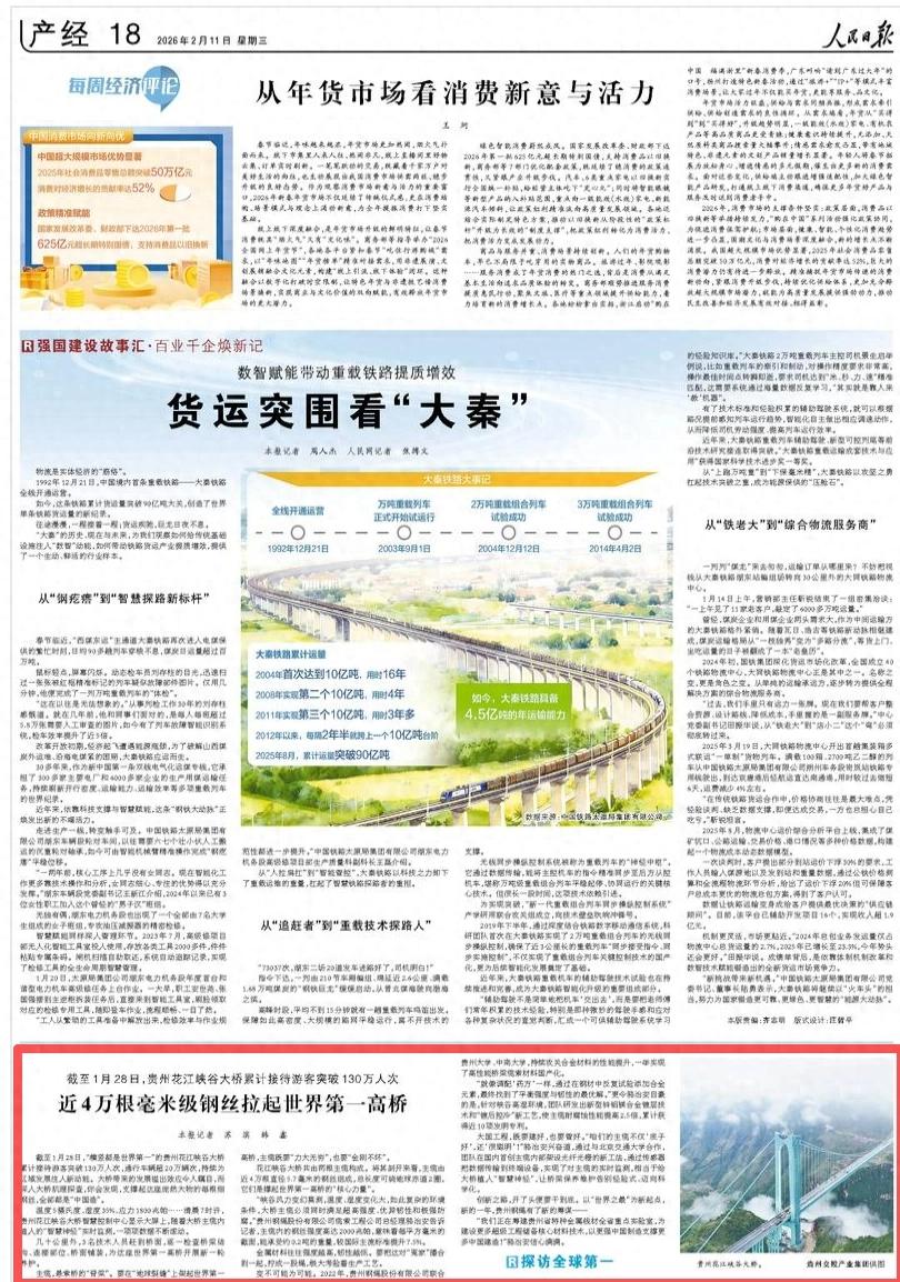 2月11日,《人民日報》刊發文章《截至1月28日,貴州花江峽谷大橋累計接待游客突破130萬人次 近4萬根毫米級鋼絲拉起世界第一高橋(探訪全球第一)》。具體報道如下: