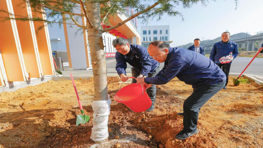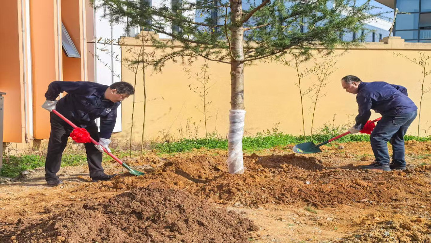 沐浴著和煦春光,植樹現場一派熱火朝天,大家揮鍬培土、澆水扶 樹、懸掛紀念銘牌。不到一小時,兩棵雪松便昂首挺立于公司新區三號大門左右兩側,如同兩位身姿挺拔的衛士,靜默守護著貴繩;廠區內,58株櫻花樹也迎風而立、靜待花開,這60棵新綠將承載著基業長青、永續發展的美好期盼,扎根沃土、向上生長,與貴繩一起,見證又一個甲子的精彩華章。