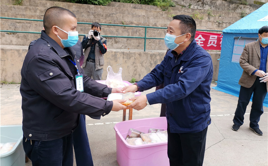 中午時分,貴繩集團公司黨委委員、副總經理梁鵬隨巨龍商貿公司餐飲部送餐車來到現場,為工作人員和志愿者發放免費的盒飯。