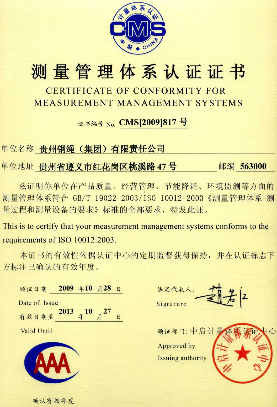 測量管理體系認證證書