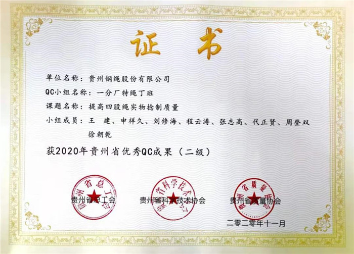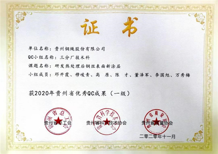 另外,在貴州省第四次“創新型”QC成果大賽中,二分廠一繩成繩乙班QC小組《研制鍛打K5×19S+PPC—16mm石油繩》和三分廠“巨龍”QC小組《研發熱處理后鋼絲表面新涂層》獲得三等獎。